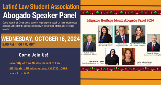 Join Brian S. Colón, Managing Partner at Singleton Schreiber in Albuquerque, at the Abogado Speaker Panel, hosted by the Latiné Law Student Association (LALSA), on October 16th, 2024, from 12:00 pm to 1:00 pm, MDT, where Mr. Colón will be one of the panel speakers!