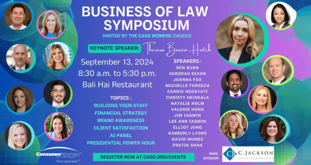 Join Carmela Birnbaum, Counsel at Singleton Schreiber and Business of Law Symposium Committee member, at the Business of Law Symposium, hosted by the CASD Women's Caucus at the Bali Hai Restaurant on September 13th, 2024, from 8:30 am to 5:30 pm, PST, where she will be moderating the "Presidential Power Hour" panel, discussing practical tools, strategies, and checklists for managing your own solo/small law practice. Singleton Schreiber is also a proud sponsor.