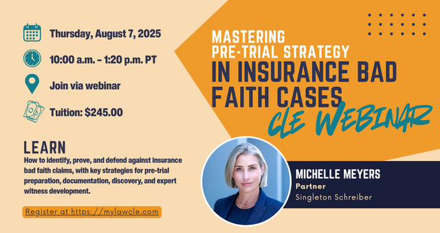 Join Michelle Meyers, Partner at Singleton Schreiber, at Mastering Pre-Trial Strategy in Insurance Bad Faith Cases, where she will be co-presenting during a live video broadcast on Thursday, August 7, 2025, from 10:00 a.m. – 1:20 p.m. PT.