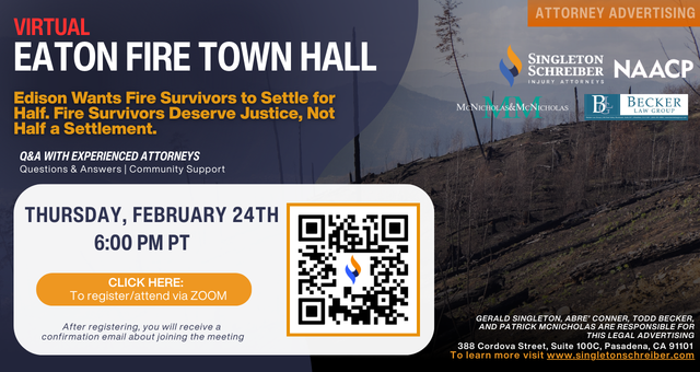 - An exclusive opportunity to ask key questions about the Eaton Fire; have your concerns addressed; learn about available resources for recovery and mental health; and hear directly from our experienced team. This town hall will provide community updates and guidance for those affected.