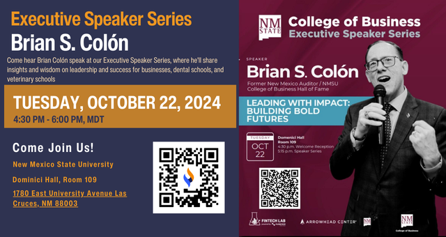 Join Brian S. Colón, Managing Partner at Singleton Schreiber, at "Executive Speaker Series: Brian S. Colón", hosted by New Mexico State University: College of Business on October 22nd, 2024, from 4:30 p.m. to 6:00 p.m., MDT, where Mr. Colón will share his insights on leadership and experiences in the business, dental, and veterinary world. Colón is recognized for his community involvement, including charitable work and advocacy for education and economic development.