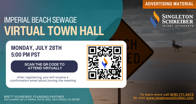 Join some of Singleton Schreiber's local attorneys for a virtual town hall regarding the Imperial Beach Sewage Spill on Monday, July 28th, 2025, at 5:00 PM PST.