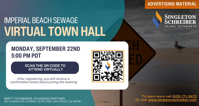 Join some of Singleton Schreiber's local attorneys for a virtual town hall regarding the Imperial Beach Sewage Spill on Monday, September 22nd, 2025, at 5:00 PM PST.
