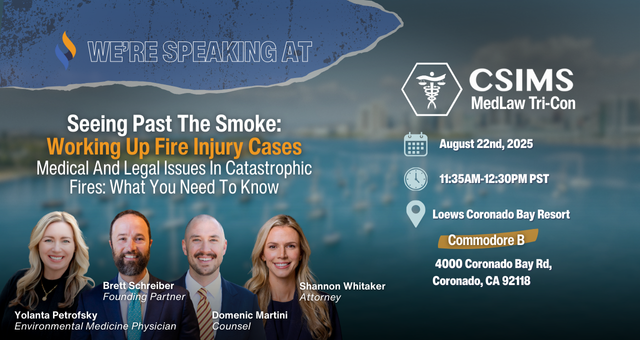 Join Yolanta Petrofsky, Environmental Medicine Physician; Brett Schreiber, Founding Partner at Singleton Schreiber; Domenic Martini, Counsel at Singleton Schreiber; and Shannon Whitaker, Attorney at Singleton Schreiber, at the CSIMS 2025 MedLaw Tri-Con, where they will be presenting “Seeing Past the Smoke: Working Up Fire Injury Cases – Medical and Legal Issues in Catastrophic Fires: What You Need to Know” on Friday, August 22, from 11:35 AM to 12:30 PM (PT).