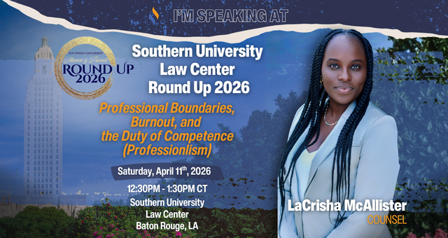 Join LaCrisha McAllistar, Counsel at Singleton Schreiber, for a CLE session at Southern University Law Center’s Alumni and Friends Round Up 2026. The session will take place on Saturday, April 11, 2026, from 12:30 PM – 1:30 PM CT.