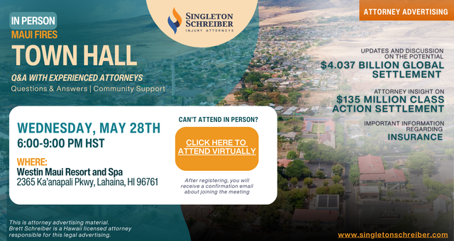 Join Singleton Schreiber at an In-Person Maui Town Hall on Wednesday, May 28th, 2025, at 6:00 PM HST.