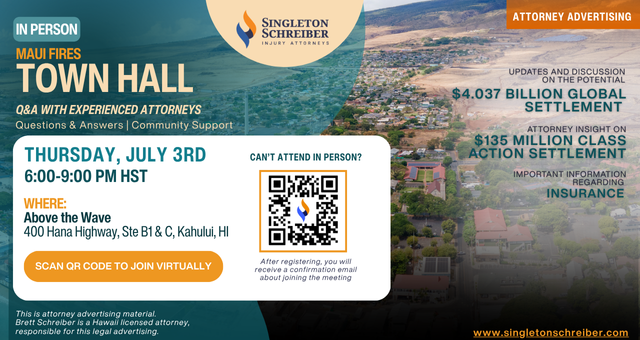 Join Singleton Schreiber at an In-Person Maui Town Hall on Thursday, July 3rd, 2025, at 6:00 PM HST.