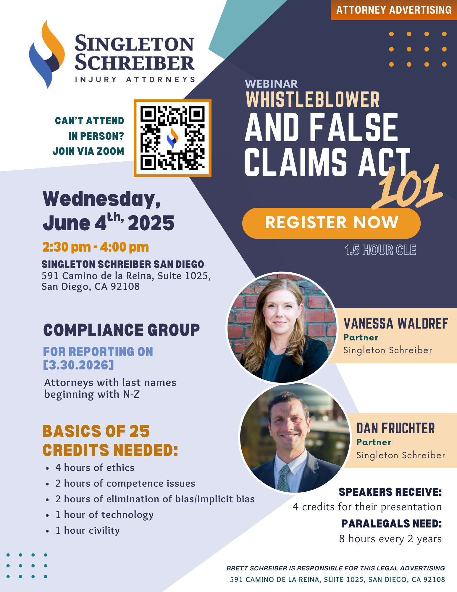 Join Dan Fruchter and Vanessa Waldref, Partners at Singleton Schreiber in Spokane, at "Whistleblower & False Claims Act 101", a hybrid California CLE training session covering the fundamentals of the False Claims Act (FCA) and whistleblower litigation at Singleton Schreiber's San Diego office on Wednesday, June 4th, from 2:30 PM - 4:00 PM, PST.