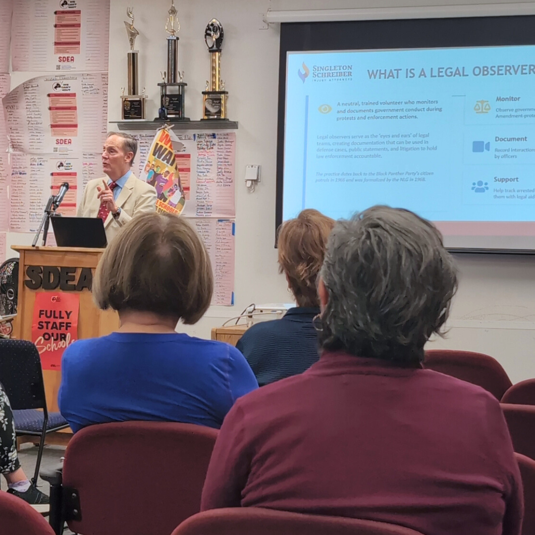 Johnson led a legal observer training organized by the San Diego County Board of Supervisors. He taught participants about the legal limits of watching federal enforcement actions. He also explained how to identify themselves as legal observers, keep a safe distance from law enforcement, and document what they see without interfering.
