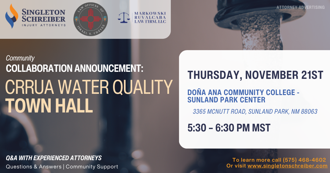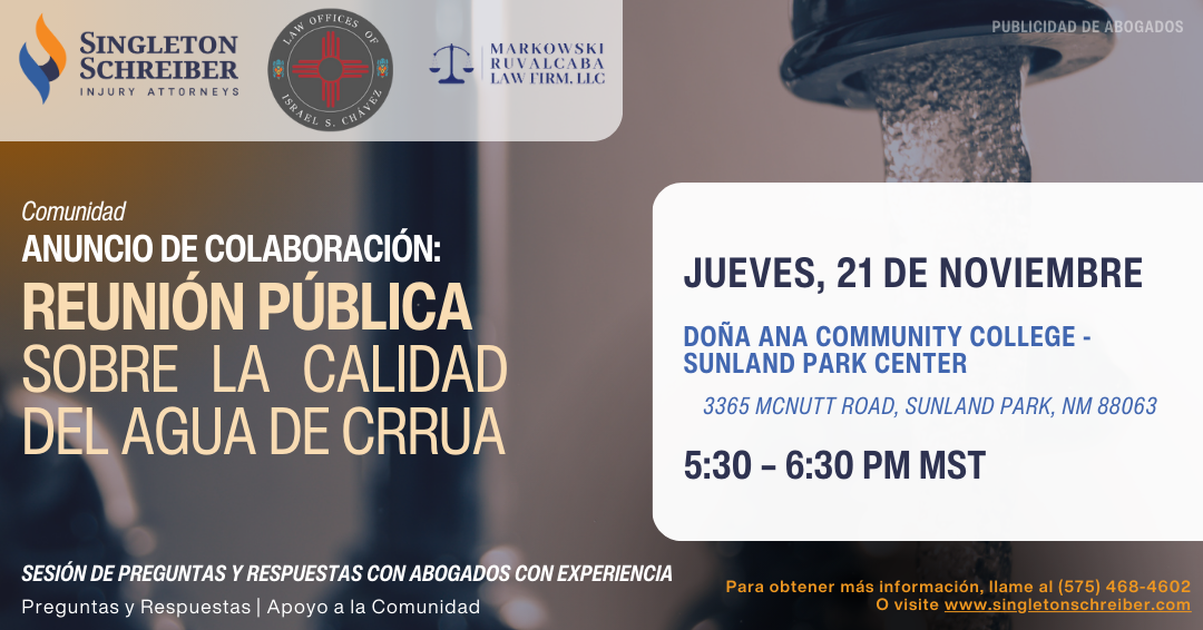 SUNLAND PARK, NEW MEXICO – Singleton Schreiber LLP, in collaboration with the Law Offices of Israel Chávez LLC and Markowski Ruvalcaba Law Firm LLC, will host a town hall meeting from 5:30 to 6:30PM MST on November 21, 2024, at the Dona Ana Community Center, located at 3365 McNutt Road, Sunland Park, New Mexico. This town hall aims to provide residents of Sunland Park, where the Camino Real Regional Utility Authority (CRRUA) supplies water, with information regarding legal action against CRRUA’s wrongful sale of arsenic-contaminated water to local community members.