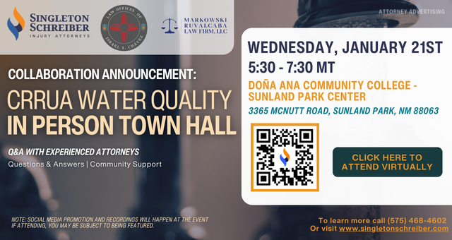 Join Singleton Schreiber's local attorneys, in collaboration with the Law Offices of Israel Chávez LLC and Markowski Ruvalcaba Law Firm LLC, for an in-person Townhall at the Doña Ana Community College - Sunland Park Center located at 3365 McNutt Rd, Sunland Park, NM 88063 on Wednesday, January 21st, 2026, from 3:30 PM - 5:30 PM, MT.