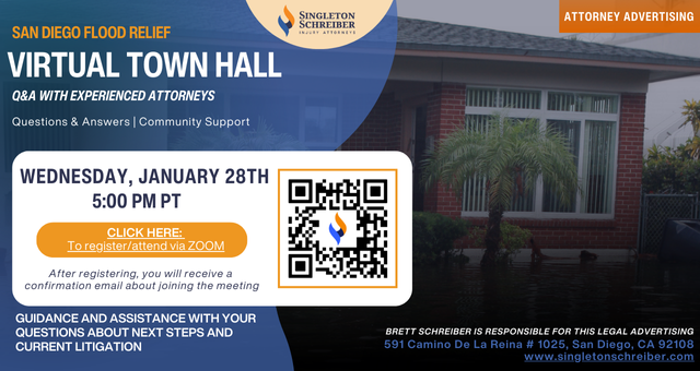 - An exclusive opportunity to ask key questions, learn about next steps & current litigation, and to have your concerns about the 2024 San Diego Floods addressed by experienced attorneys.